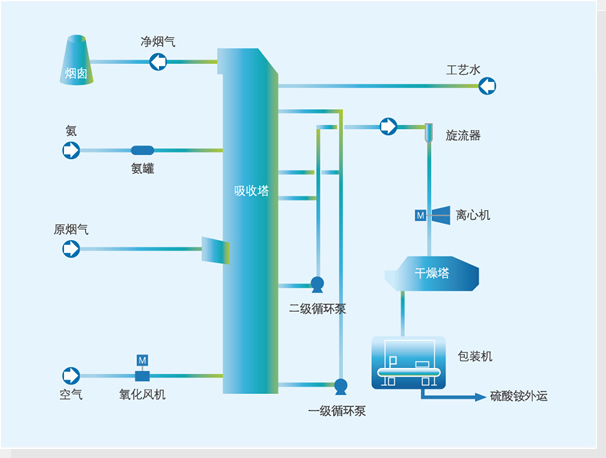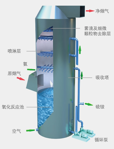 煤、石油中含有一定含量的硫,高温燃烧后产生硫氧化物(SO2和SO3),对大气环境造成严重污染,江南氨法脱硫技术以NH3和SO2反应为基础,在多功能烟气脱硫吸收塔中,氨将烟气中的SO2吸收得到脱硫中间产品亚硫酸(氢)铵的溶液,鼓入空气,将亚硫酸(氢)铵直接氧化成硫酸铵。